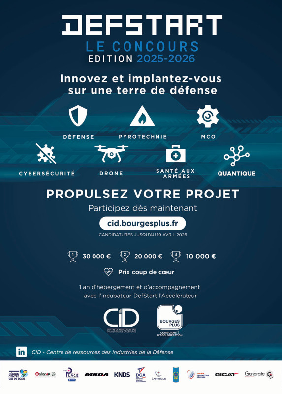 Ce concours est organisé avec le soutien et l’expertise de nos partenaires : Région Centre-Val de Loire, Dev’Up Centre-Val de Loire, The Place by CCI 18, MBDA, KNDS, la Direction Générale de l’Armement Techniques et Terrestres (DGA-TT) – Pôle INNOVATER, le cluster Lahitolle, les Écoles Militaires de Bourges, l’Agence de l’Innovation de Défense, le GICAT et son programme Generate.